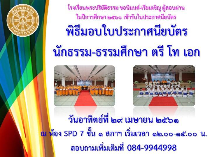 ขอเชิญมาร่วมงานให้กำลังใจและรับใบประกาศนียบัตรนักธรรมและธรรมศึกษาโดยพร้องเพรียงกัน